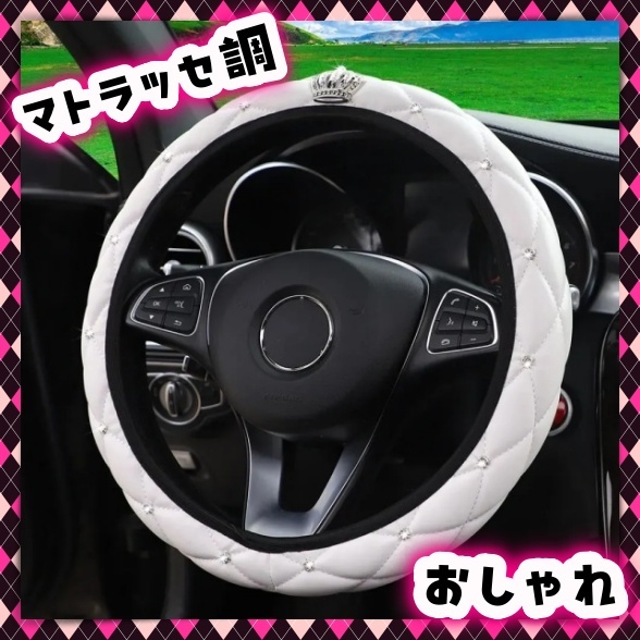 - ハンドルカバー M S マトラッセ調 王冠 ラインストーン 白 ホワイト ステアリングカバー フェミニン キラかわ 汎用 普通自動車 軽自動車
