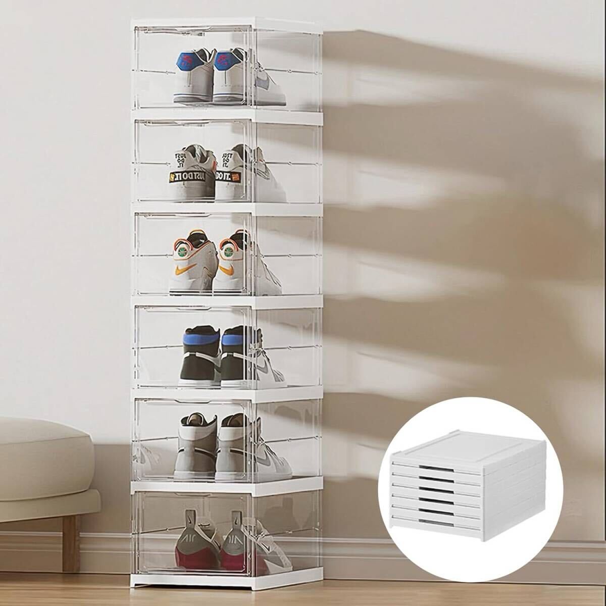 - シューズラック シューズ収納 折りたたみ式 4面透明 収納ボックス シューズケース スニーカー ボックス ホワイト