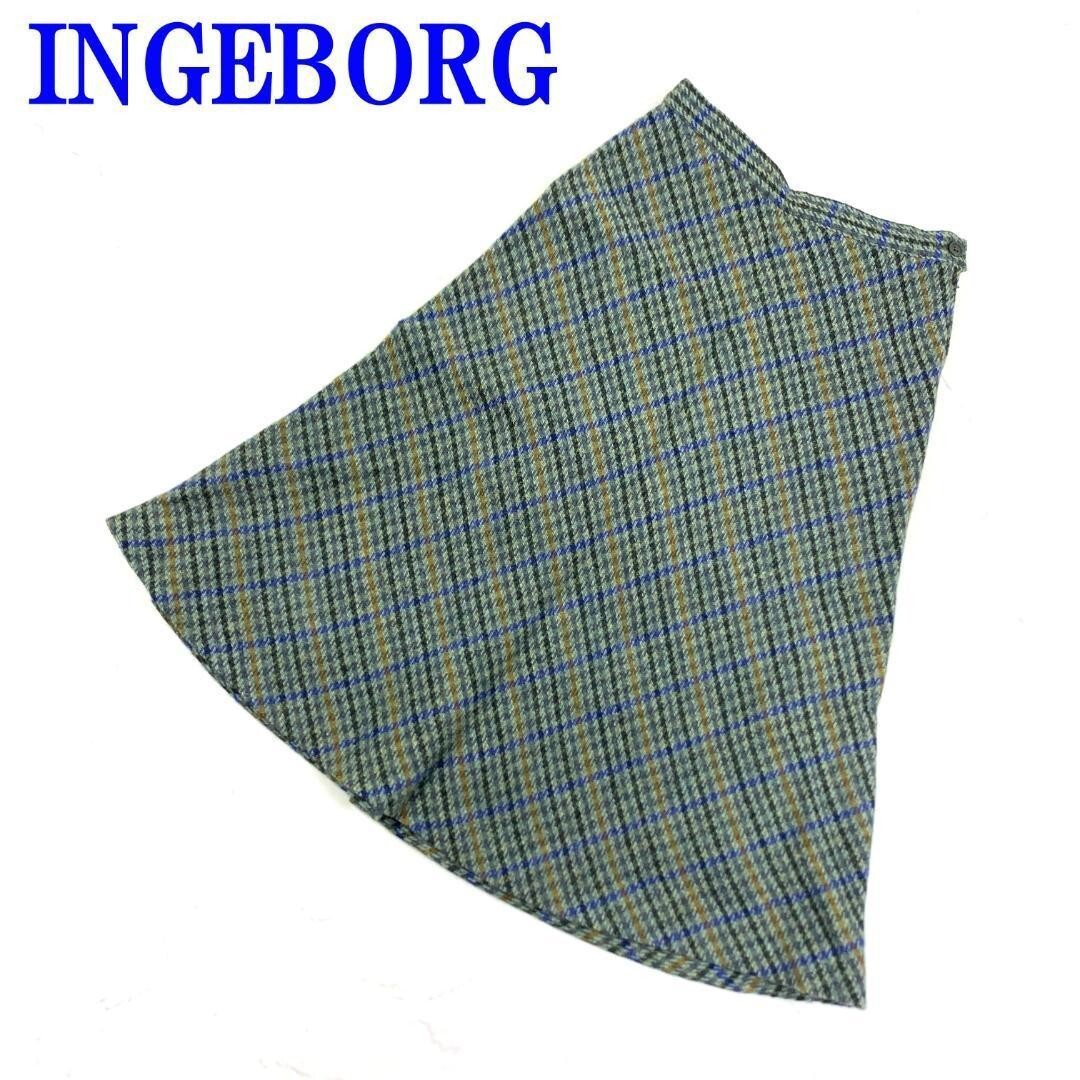 - インゲボルグ ロングスカート フレア ウール チェックINGEBORG グリーン 緑 M相当 C2021