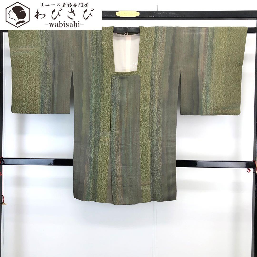 市紅茶色ベースの緑味ベースのお色味に暈し、縦柄模様がデザインされた雰囲気の良い素敵な柄裄のお品でございます。