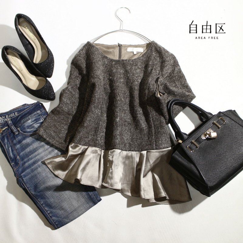 > 美品 ジユウク 自由区 株) オンワード樫山 お洒落 小さいサイズ32 艶サテン切替 ウールカットソー ミックスカラー グレイッシュ ブラウン