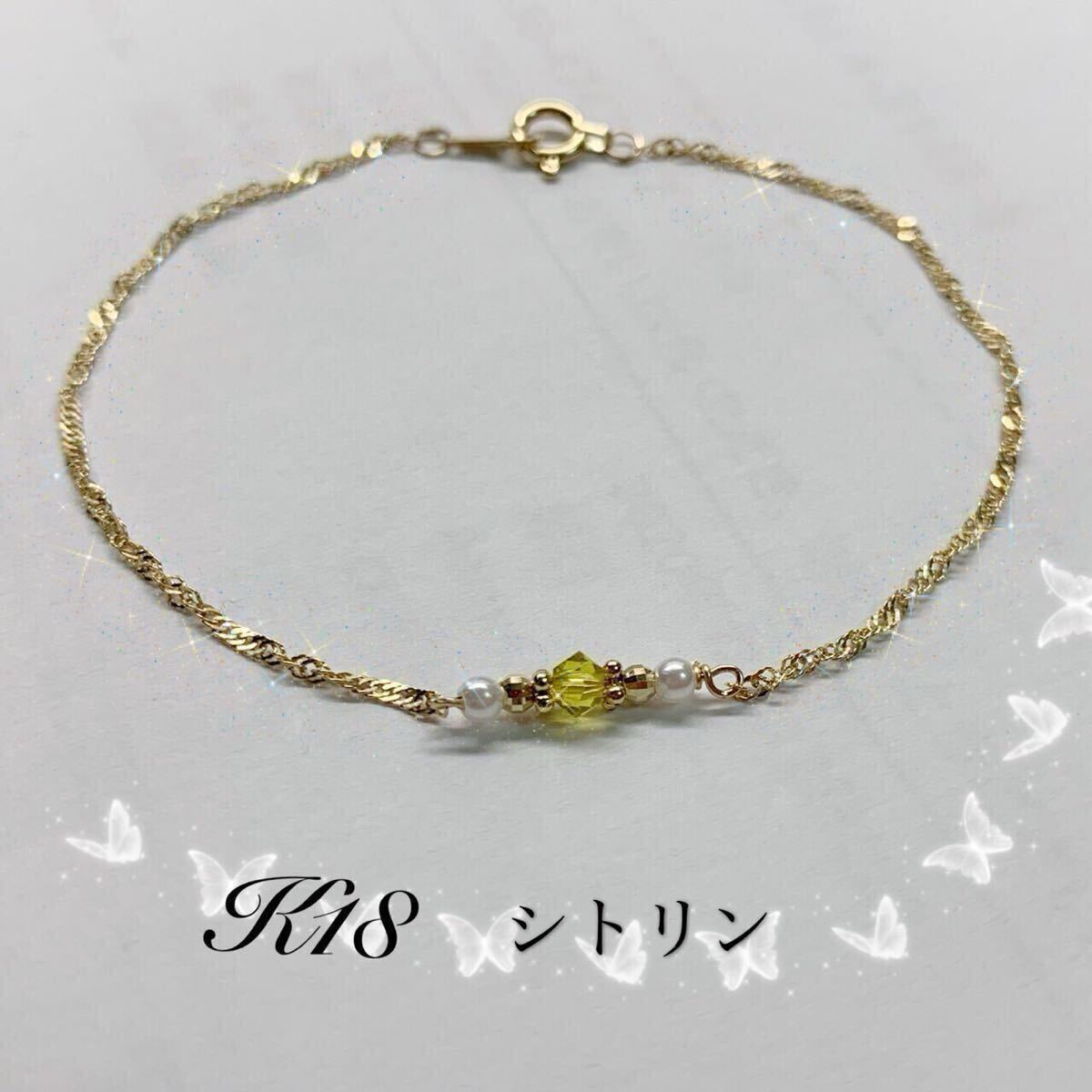 > k18 18金 15.5cm シトリン3mm ミラーボール2.5mm パール2mm スクリューチェーン0.9mm ブレスレット イエローゴールド