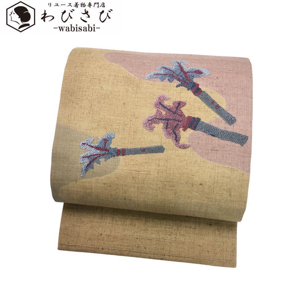 > 名古屋帯 刺繍柄草花模様 染分け 紬 枯野色 O-3510 着物 きもの kimono 和服 和装 中古 リサイクル着物 【送料無料】