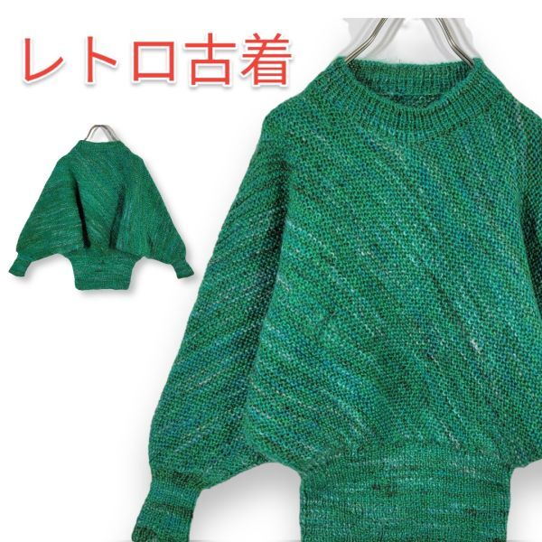 - 80s 90s ビンテージ オーダーメイド ミックスニット セーター マルチカラー クルーネット ゆる袖 わきダボ感 緑 グリーン 腹巻 匿名配送