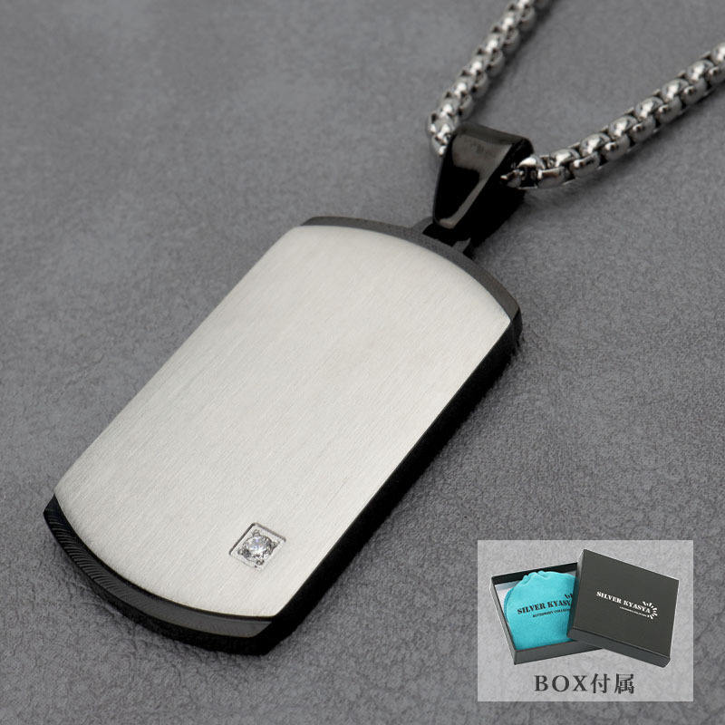 > つや消し マットシルバー ドッグタグネックレス シンプル プレートネックレス メンズ ストーン ベネチアンチェーン 専用BOX付属