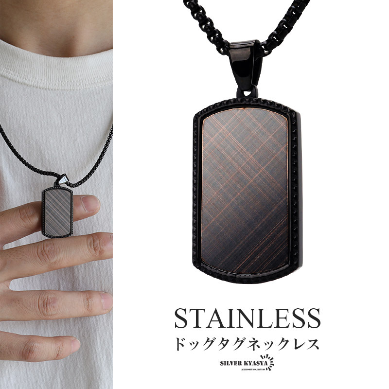 - ステンレス ドッグタグネックレス タータンチェック柄ネックレス ブラック ロールチェーン 高級感