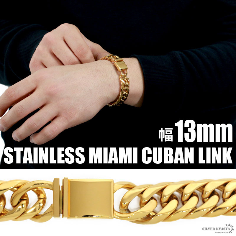 > 幅13mm ステンレス 6面カット ダブル喜平ブレスレット 18KGP ステンレス ゴールド 金 21cm 差し込み式