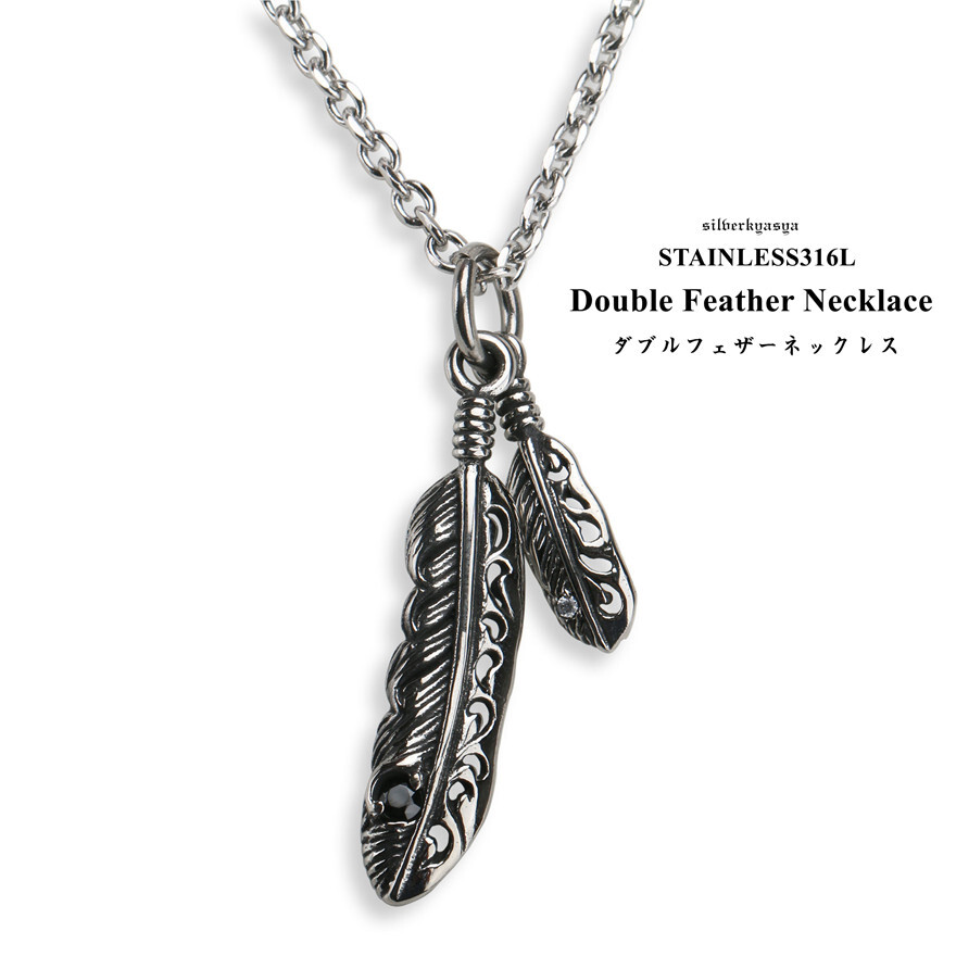 - 316L ステンレス ダブルフェザーネックレス 羽根 ペンダント フェザーネックレス シルバー ネイティブ フェザー2枚