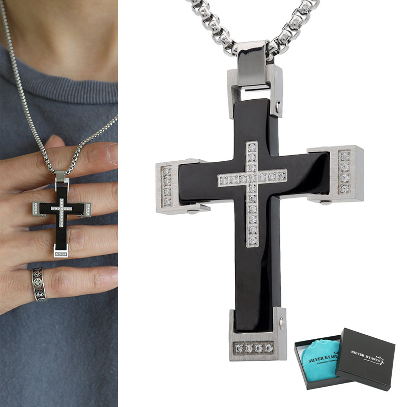 - ストーン付き クロスネックレス 高級感 機械美 メンズネックレス ステンレス かっこいい ベネチアンチェーン付き 専用BOX付属