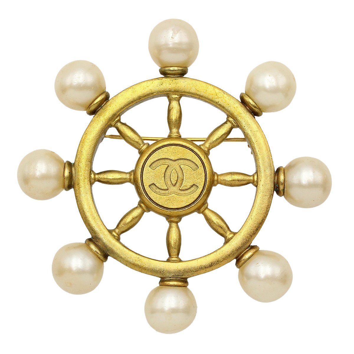 ★E2068 美品 シャネル 舵 モチーフ ココマーク フェイクパール ラウンド ブローチ 94P ホワイト×ゴールド金具 ヴィンテージ レディース★