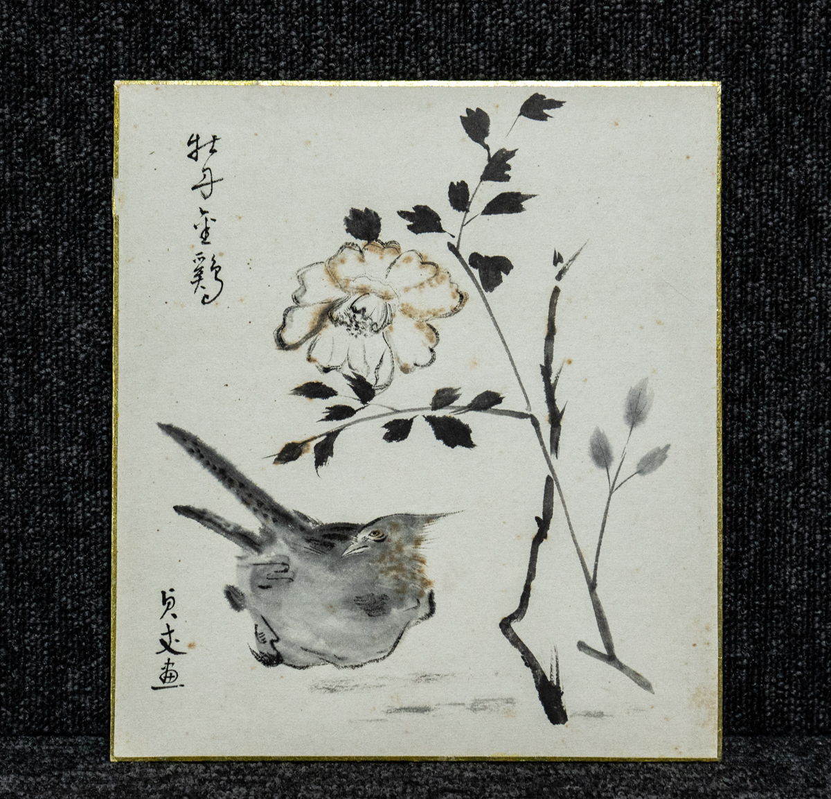- 色紙ー1579 5代目 一龍斎貞丈 牡丹金鶏 講談師【真作】