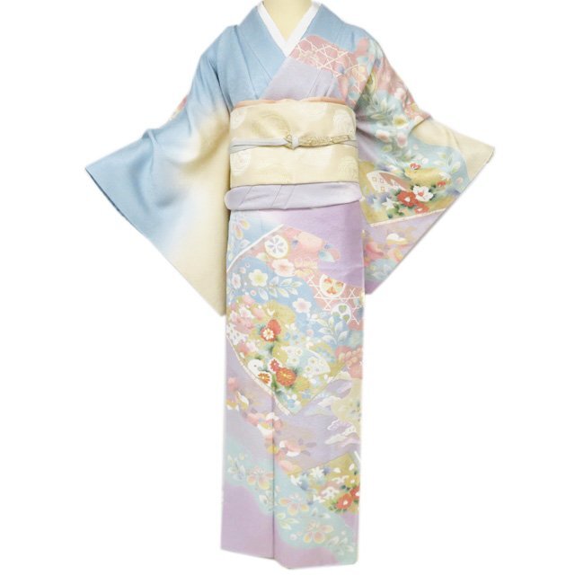 - 訪問着 着物 中古 リサイクル 正絹 袷 フォーマル 金駒刺繍 花の図 流水 多色 金 身丈167cm 裄66cm L トール きもの北條 A1144-3