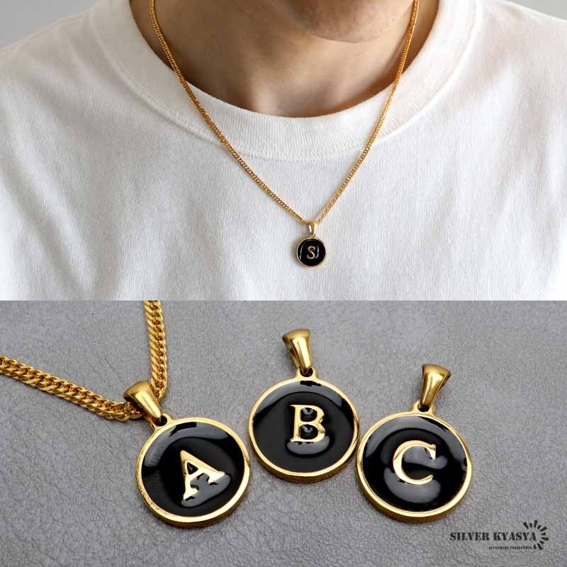 - (U、60cm) イニシャルネックレス ゴールド ブラック ラウンド ステンレス 18KGP ダブル喜平 金属アレルギー対応