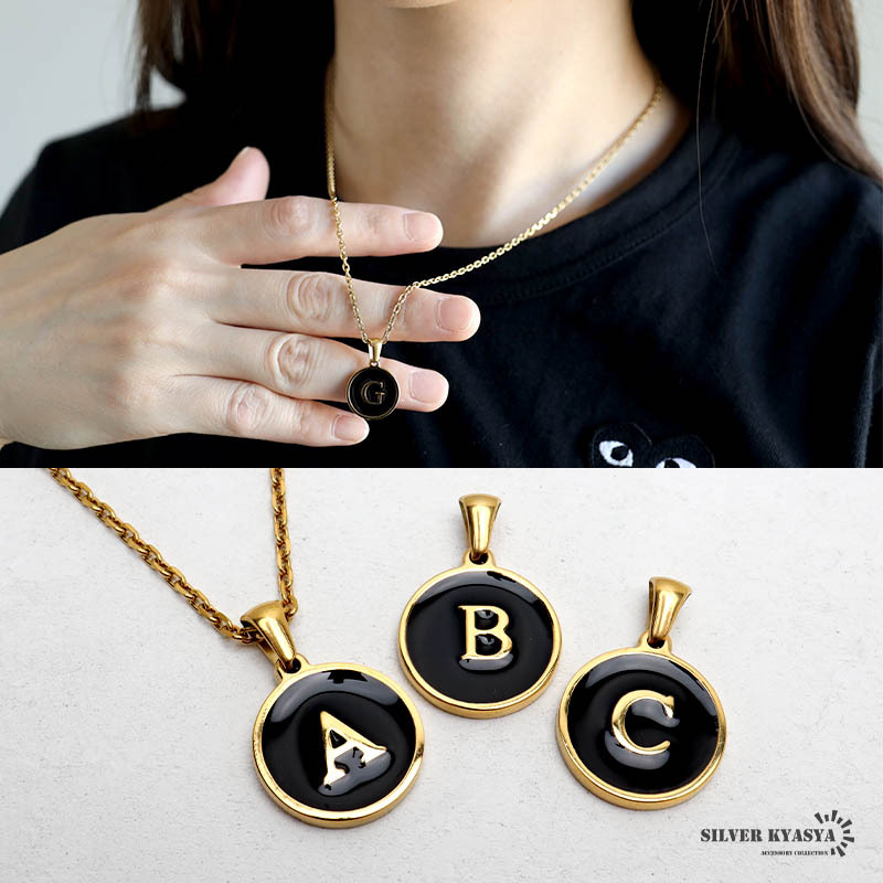 - (Q、50cm) イニシャルネックレス ゴールド ブラック ラウンド ステンレス 18KGP あずきチェーン 金属アレルギー対応