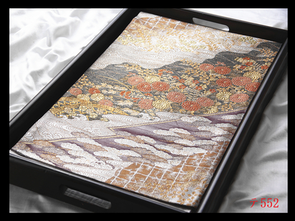 - 蔵【テ552】西陣美品 秋草紋 シルバー色紫鳶色 気品豊かに 正絹純金糸六通高級美術袋帯 ◇検簪着物名古屋帯和装小物帯締め