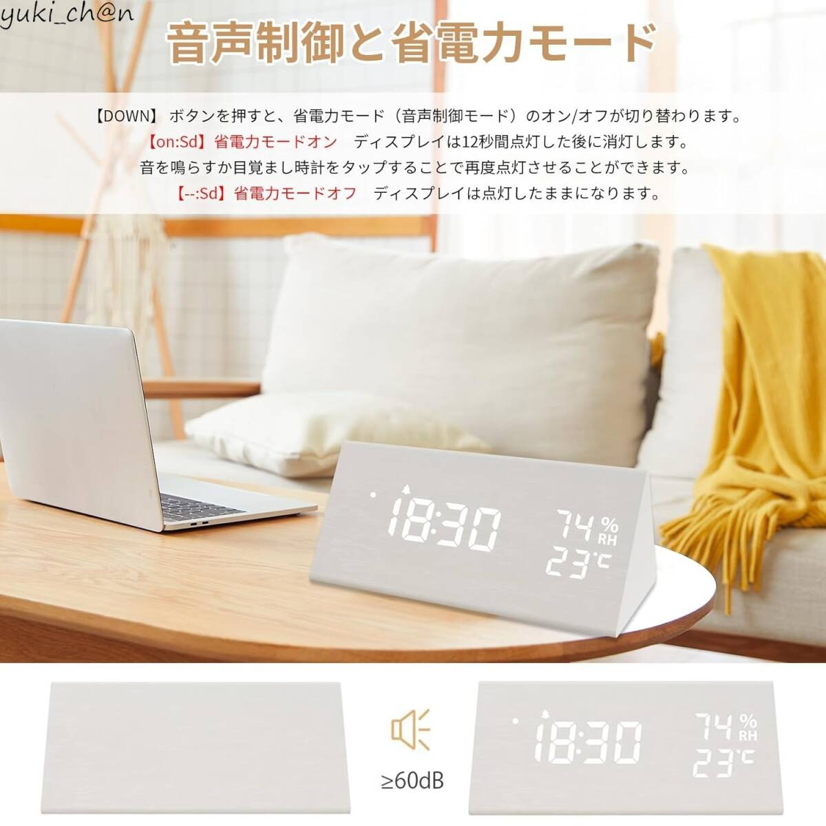 - 多機能木目調置時計 ホワイト デジタル目覚まし時計 3つのアラーム 音声感知 明るさ3段階 温度/湿度 LED表示 省電力モード