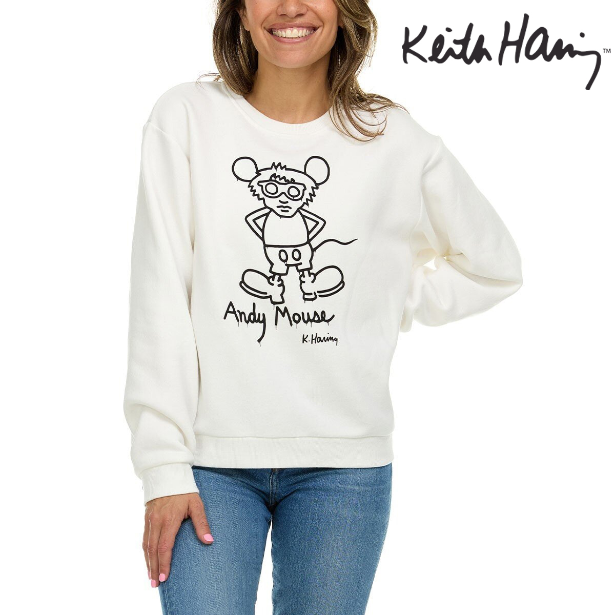 > 新品 S ★ キースヘリング レディース トレーナー 裏起毛 オフホワイト アンディマウス Keith Haring Andy Mouse アンディウォーホル 長袖