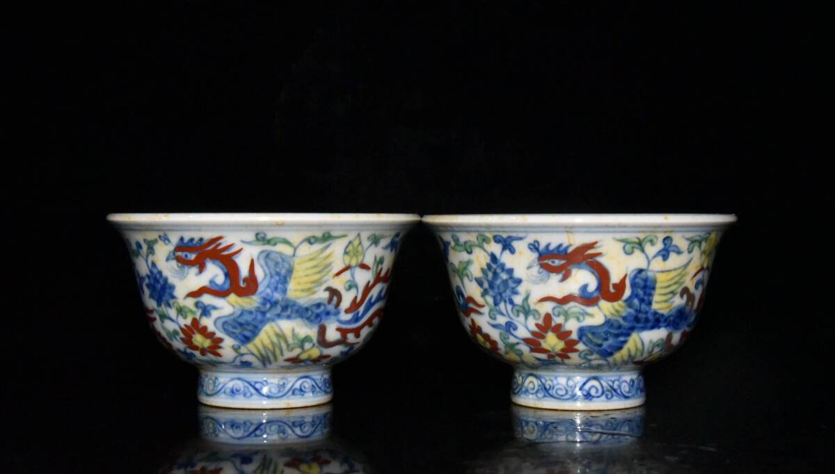 > 【超珍館蔵】明 成化年製款 古陶瓷品 紅釉 斗彩 鳳紋 壓手杯一對 置物 古賞物 古美術品 稀少珍蔵品