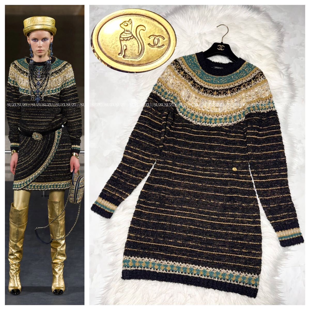 > 本物 エジプトランウェイモデル シャネル 最高級ライン COCO装飾 クレオパトラ 長袖 ニット ワンピース ドレス 36 ココマーク CHANEL