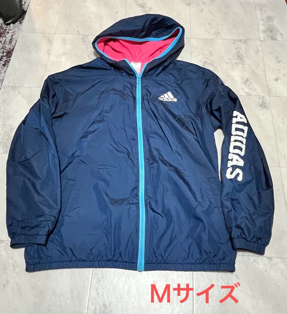 - アディダス adidas 紺 ピンク パーカー ジップアップ フード 裏起毛 ロゴ Mサイズ