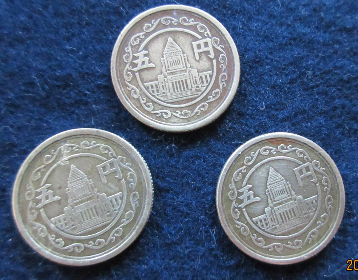 - ●穴無し5円玉・黄銅貨・昭和二十三年=3枚・国会議事堂・鳩・梅花・流通品