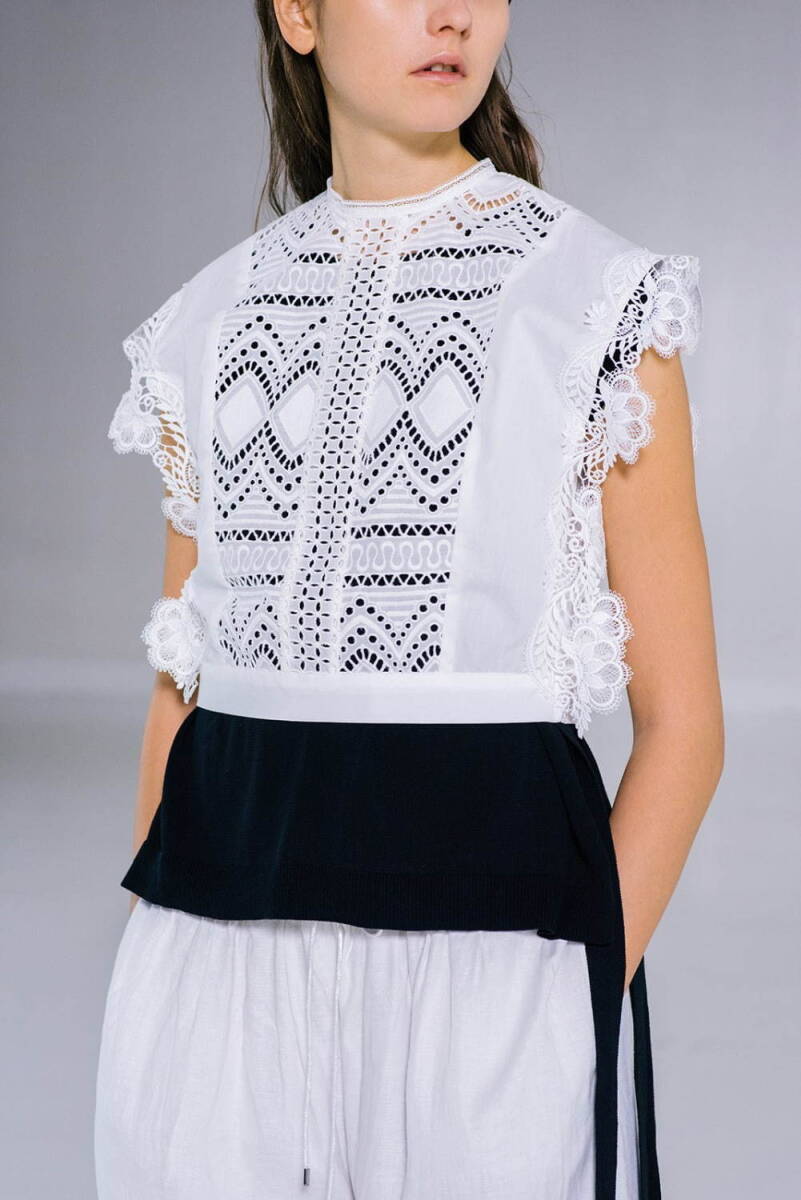 > 新品 定価1.7万 MIDIUMISOLID ノースリーブブラウス 白 MARcourt ミディウミ ショート丈 レース