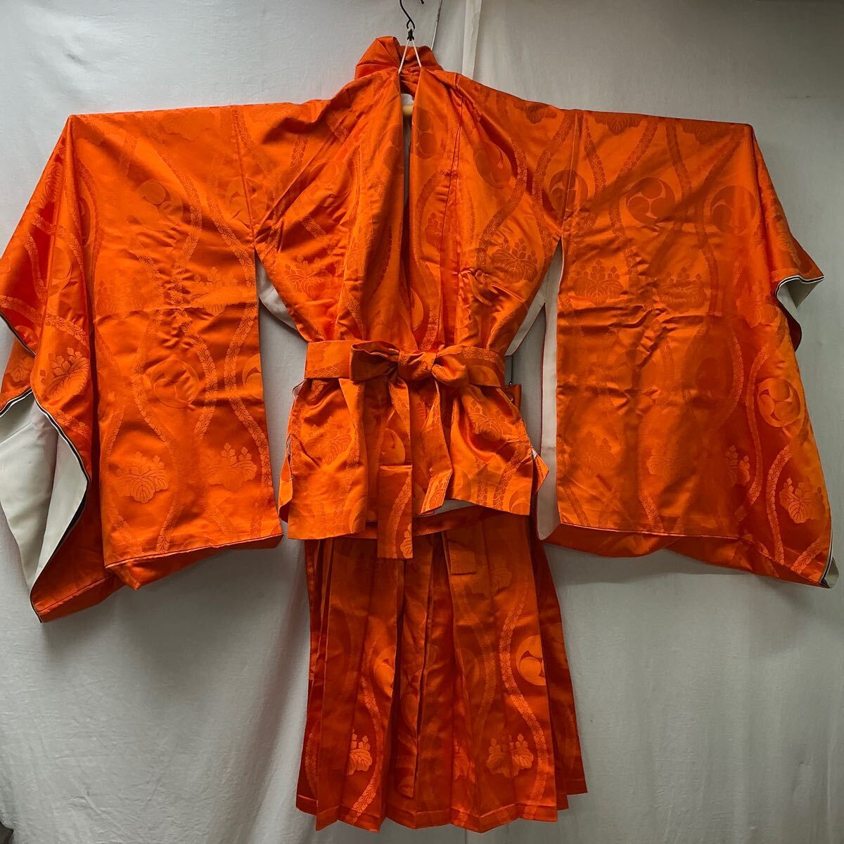 > 【A889】送無 美品 真言宗 緋袍服 高野山衣 上下セット 絹 色無地 橙色 五三の桐紋 巴紋 たとう紙 箱入 法衣 法要 装束 着物 僧侶 お坊さん