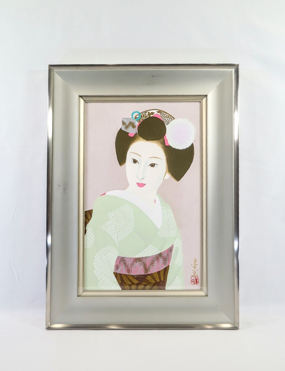 - 真作 室井東志生 日本画「舞妓」画寸 10号 福島県出身 日展理事、評議員 橋本明治に師事 柔らかな質感、洗練されたモダンな和装美人 10417