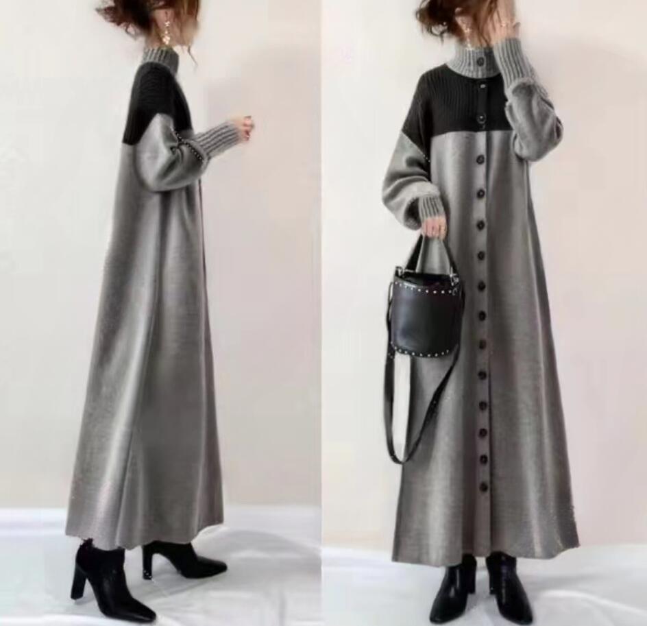 - 人気推薦/上質 ハイネック 配色 ニットワンピース 秋冬 長袖 ロングワンピース 細見え 体型カバー 通勤 着痩せ 大人 ミモレ丈 ワンピース/S