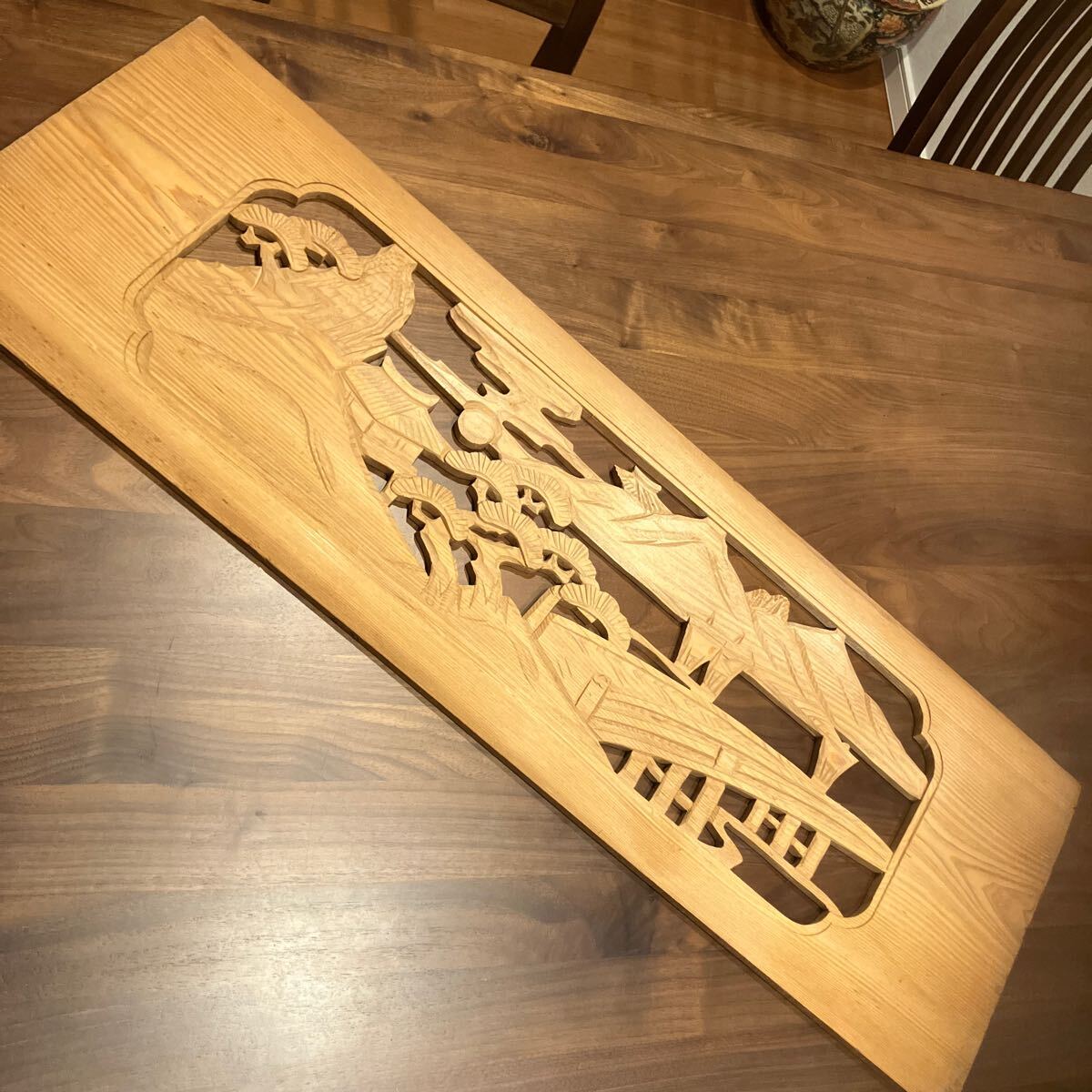 > 透かし彫り 欄間 木製 ヒノキ 山水と松の木 アンティーク 骨董 コレクター 蚤の市 旧家出物 木彫 JAPAN 和風 技巧 縁起物 和