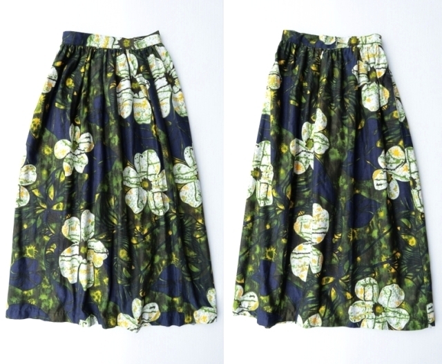 > ◆ UNKNOWN カーテン生地 ロングスカート S W26 花柄 紺×黄色 ネイビー/ビンテージ オールド レトロ アメリカ古着 レディース アート