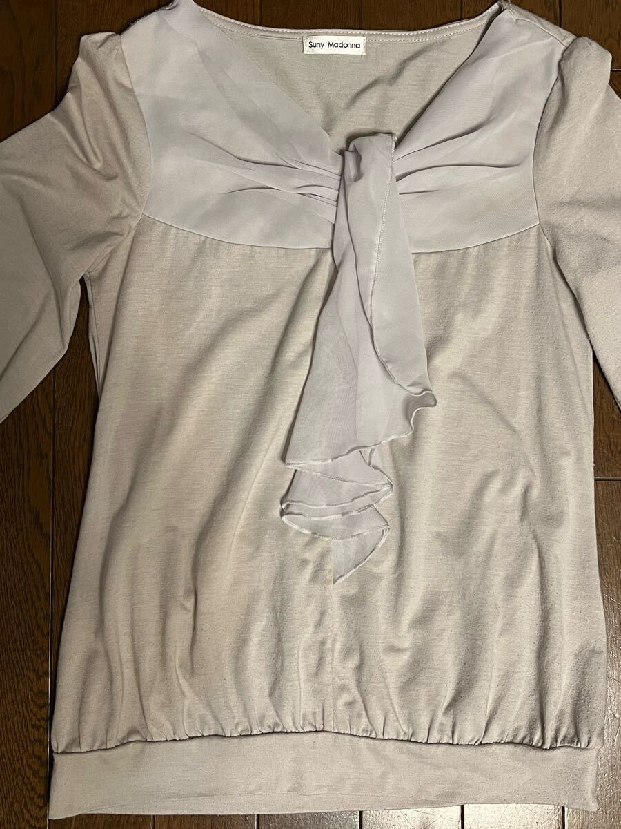 - 5分袖カットソー フロントリボン付き ライトグレー 五分袖トップス カットソー 大人可愛い フリル