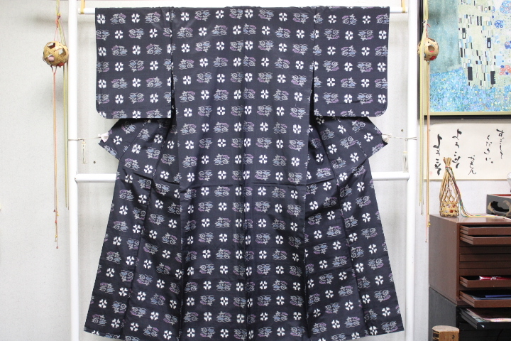 > きもの今昔8280 単衣の紬のきもの 広衿単衣手縫い仕立 正絹平織絣大島地風 しみ汚れ無く未使用に近い 身丈151cm