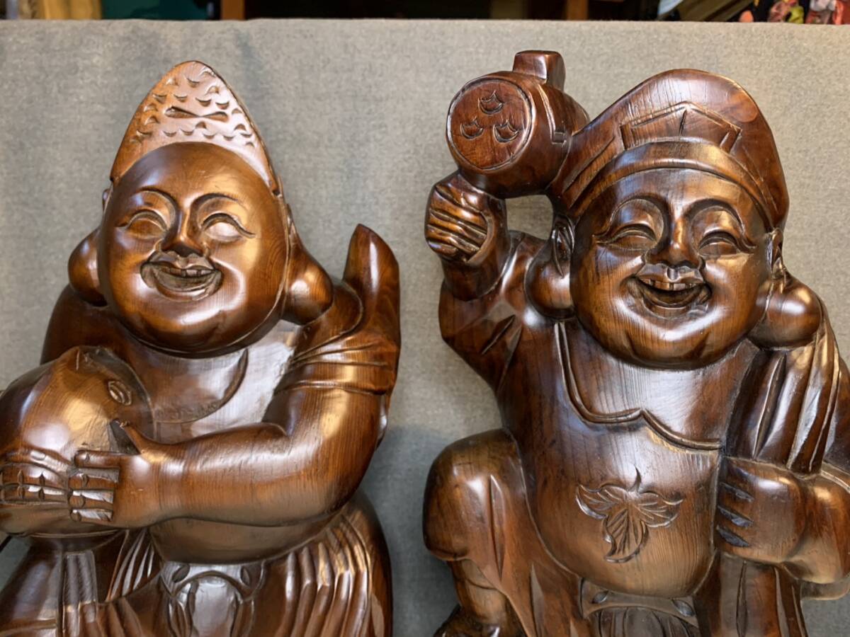 - 148-13 木彫 彫刻 無垢 2体セット 樟 恵比寿-大黒 茶道具 書道具 文房具 盆栽具 華道具