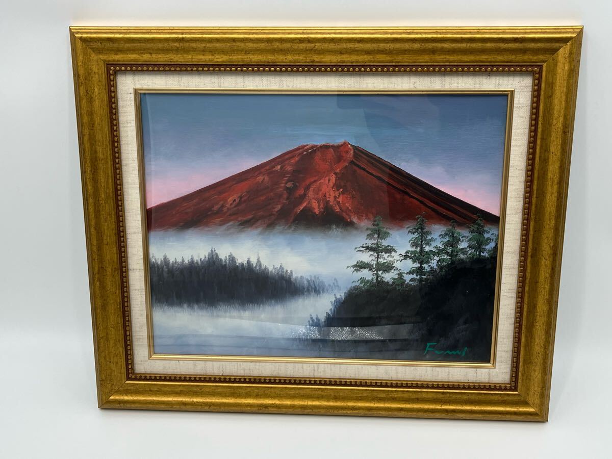 - 一柳富美 「赤富士」 油彩 額装 油彩画 真作 風景画 絵画
