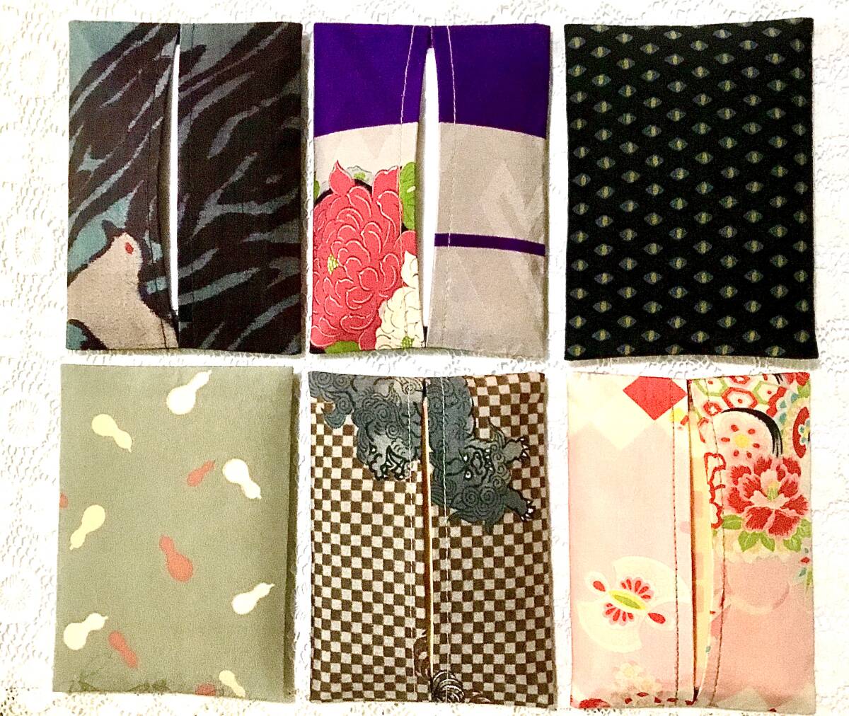 - 古布704 ティッシュ入れ6個・絹(菊・千鳥・獅子・瓢箪)時代着物地