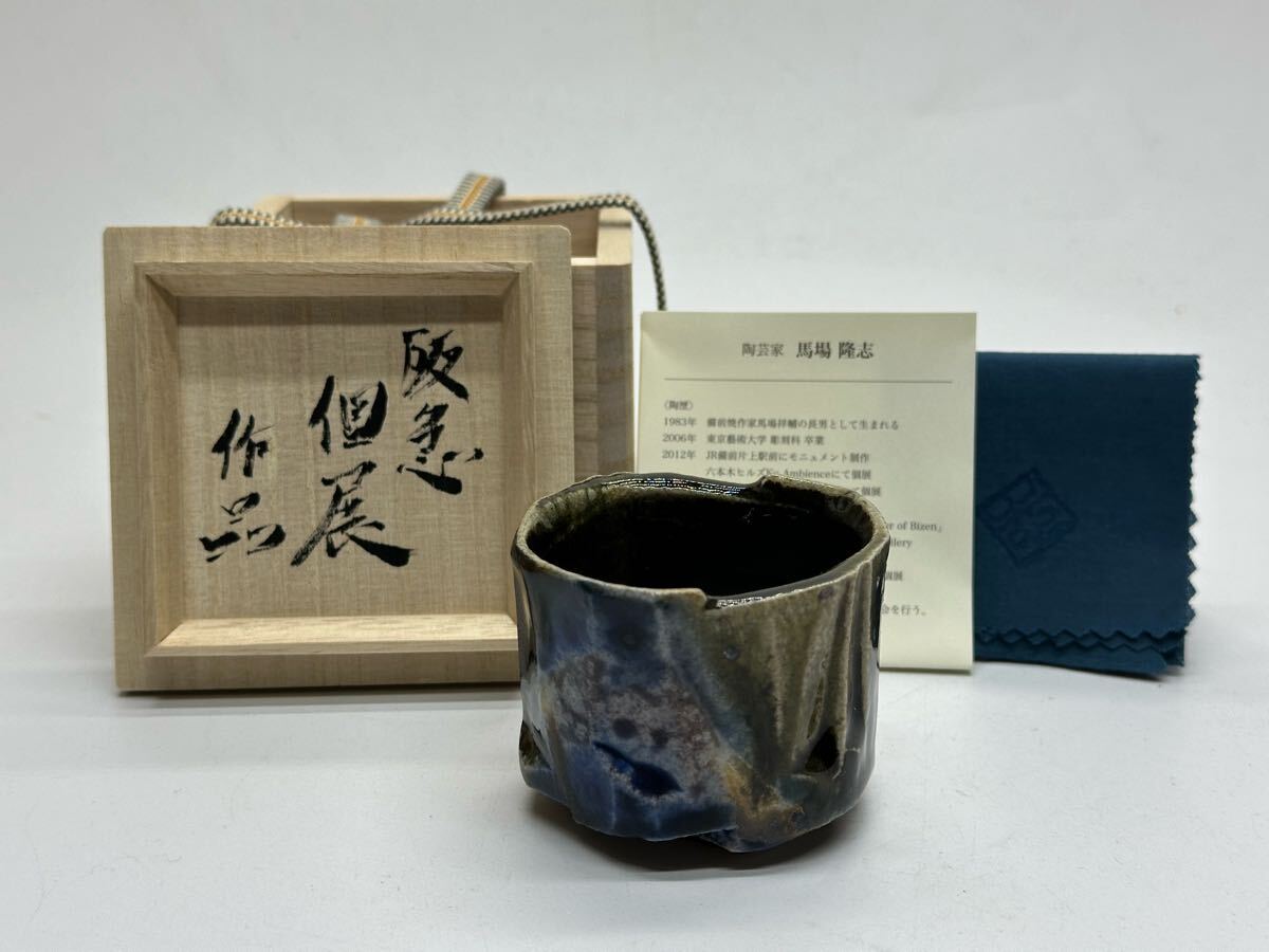 - 阪急百貨店 個展作 馬場隆志 備前 窯変蒼 ぐい呑 面取り 共箱 共布 栞