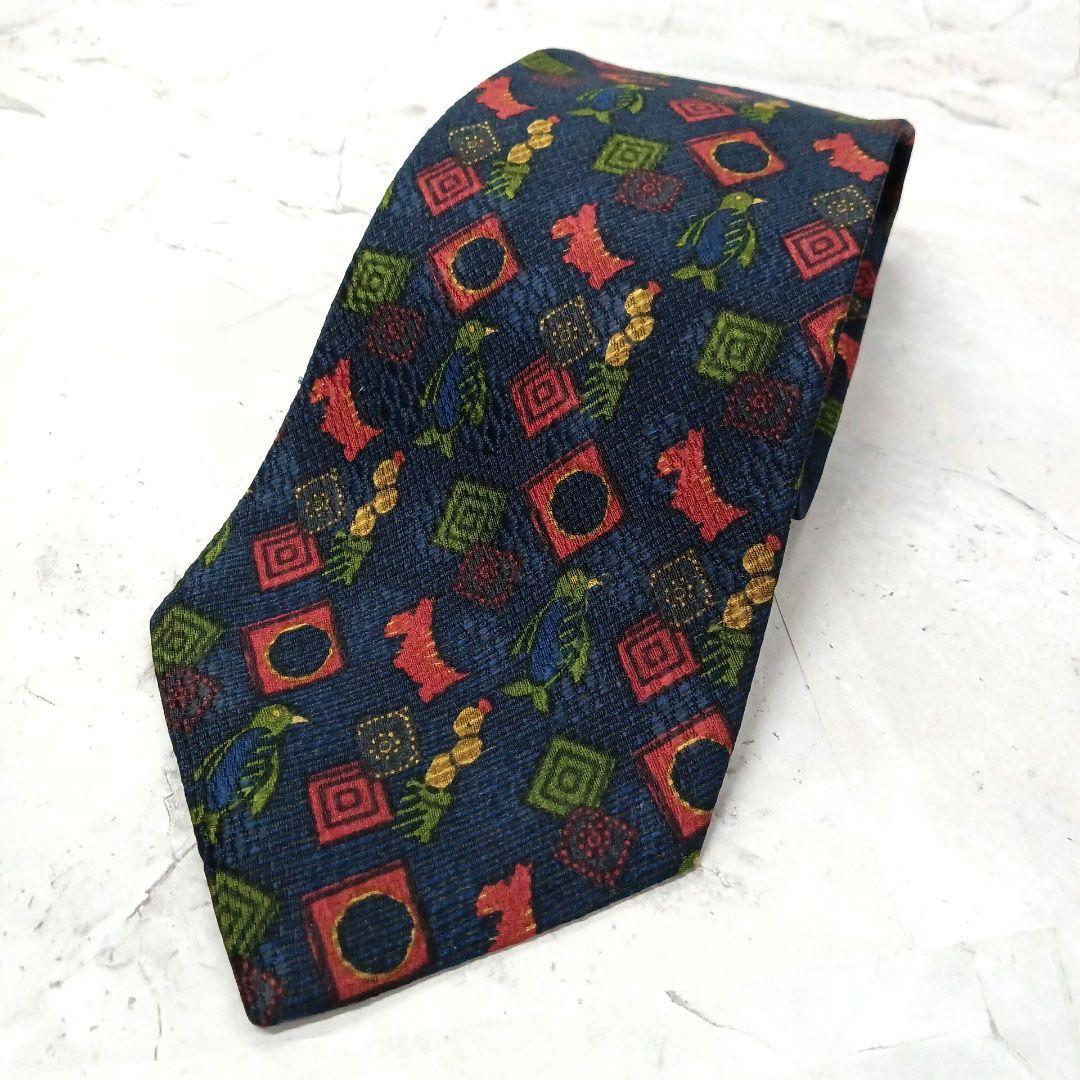 - エルメネジルドゼニア ネクタイ 紺 赤 緑 総柄 シルク100 【n458】