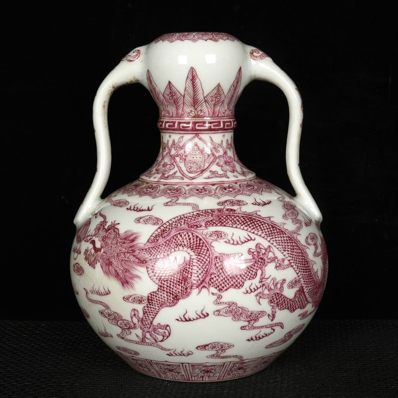 > 『館蔵珍品 清 乾隆年製款 古陶瓷品 紅彩 云龍紋 如意耳蒜頭瓶』置物 賞物 貴重物品 収蔵品 中国古美術