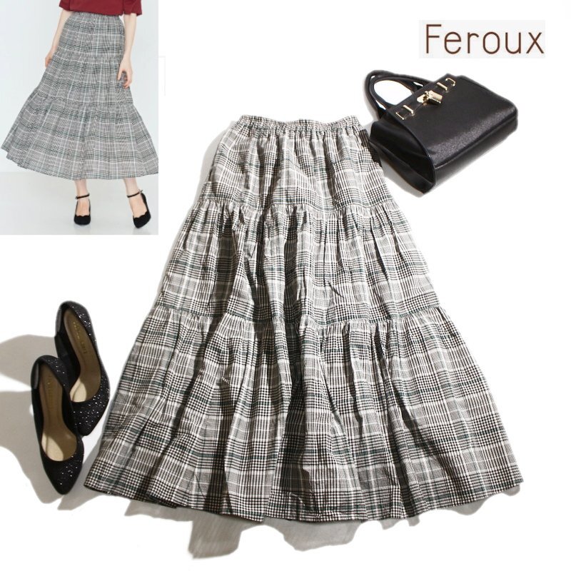 - 美品 Feroux フェルゥ 株) オンワード樫山 春 夏 洗える 60ボイルローン スカート チェック 柄 テアードスカート ロング丈 ブラック 黒