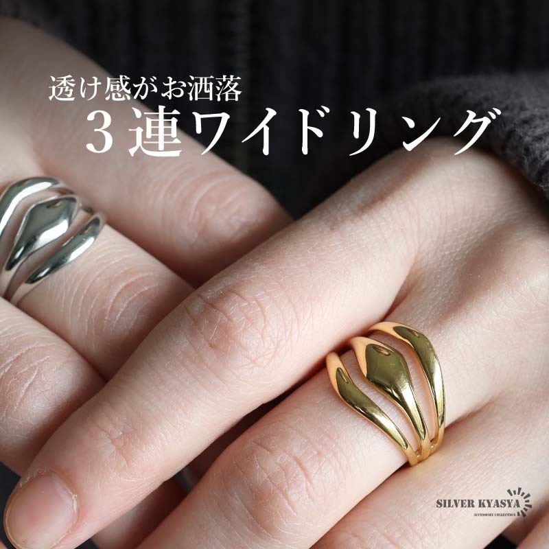 - (ゴールド) ステンレス 3連リング ワイドリング 透かし ゴールド 18K GP フリーサイズ 女性 金属アレルギー対応