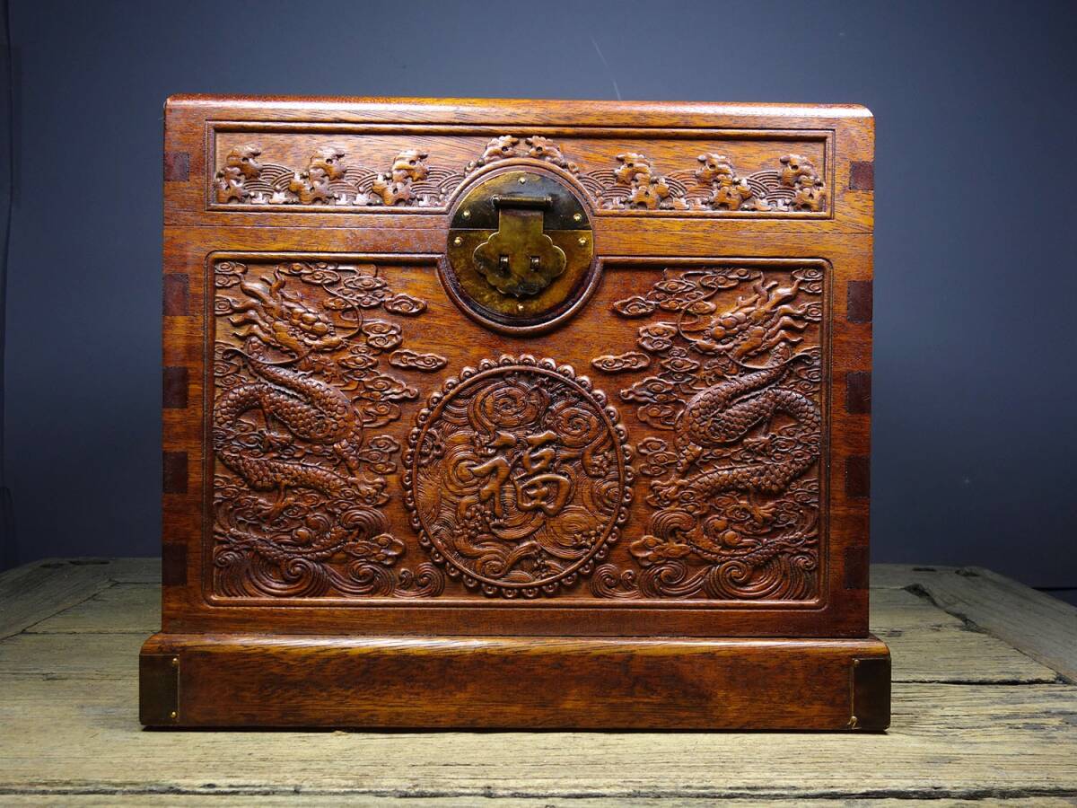 - 【仁】『花梨木製・細密彫・神龍獻瑞紋・首飾箱・置物・賞物』極細工 古賞物 中国古玩 古美術 古美味