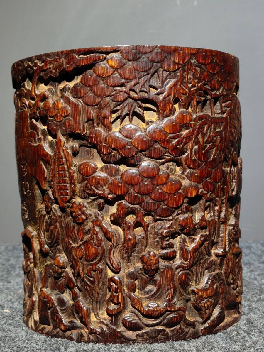- 【仁】『竹材細密彫・十八羅漢紋・筆筒・置物・賞物』極細工 古賞物 中国古玩 古美術 古美味