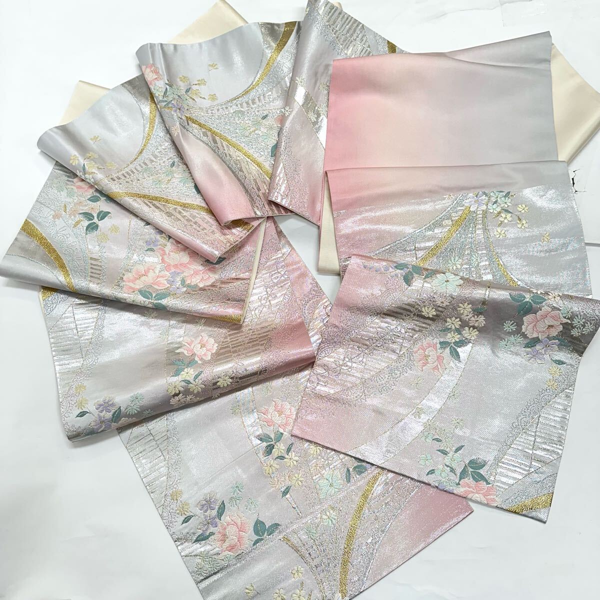 - 【七福】c444 逸品 高級品 正絹 袋帯 六通 金糸 銀糸 ラメ 花柄 刺繍 豪華