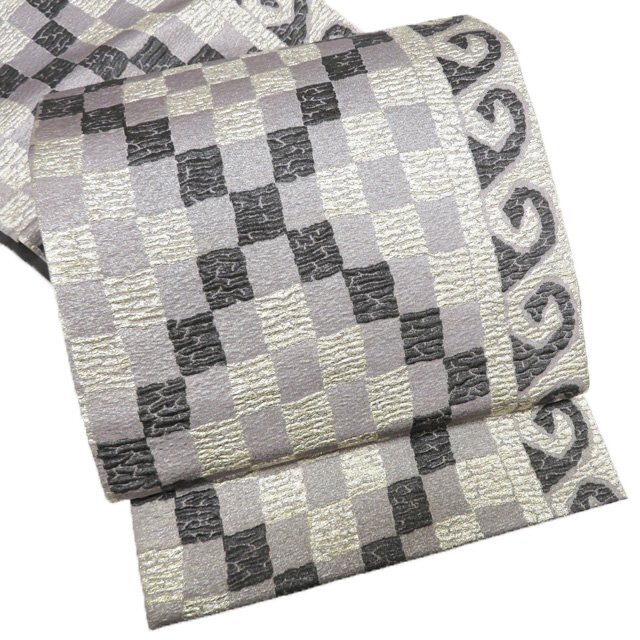 - 袋帯 未使用 正絹 フォーマル 仕立て上がり 六通 市松模様 箔糸 鼠色 黒色 銀 きもの北條 A1158-15