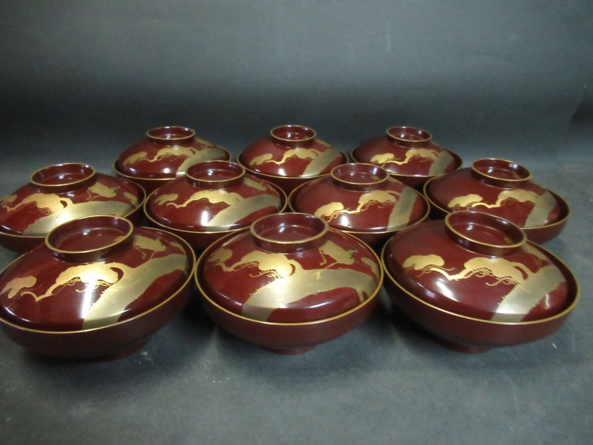 - 【広吉堂】輪島塗 吸物椀 蒔絵 木製 鶴 栗色 美品 10客A