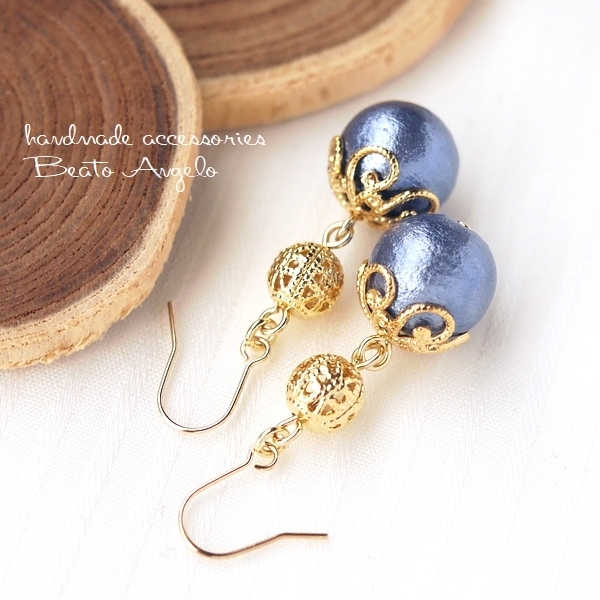 - ◇◇+angelo+コットンパールと透かし玉のピアス(p-448)ライトブルー G 10mm 花座