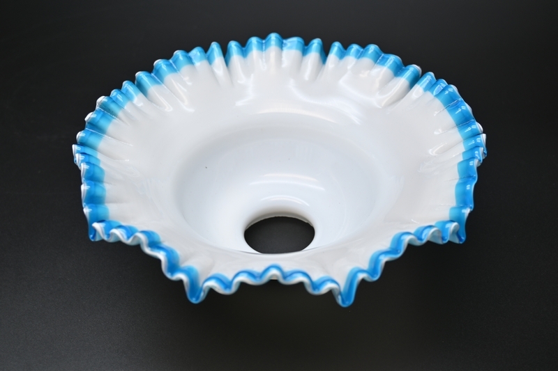 - 電笠 レトロ 大正 ■ ロマン 溢れる 電傘 [フリル 乳白色 ミルクガラス ] 波型フリル ランプシェード ■ 縁青 ブルー 時代照明 骨董 ■