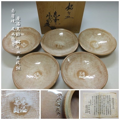 - 【T-335】赤膚焼 尾西楽斎 「慶溢萬齢」 銘々皿5枚組 共箱付 茶道具