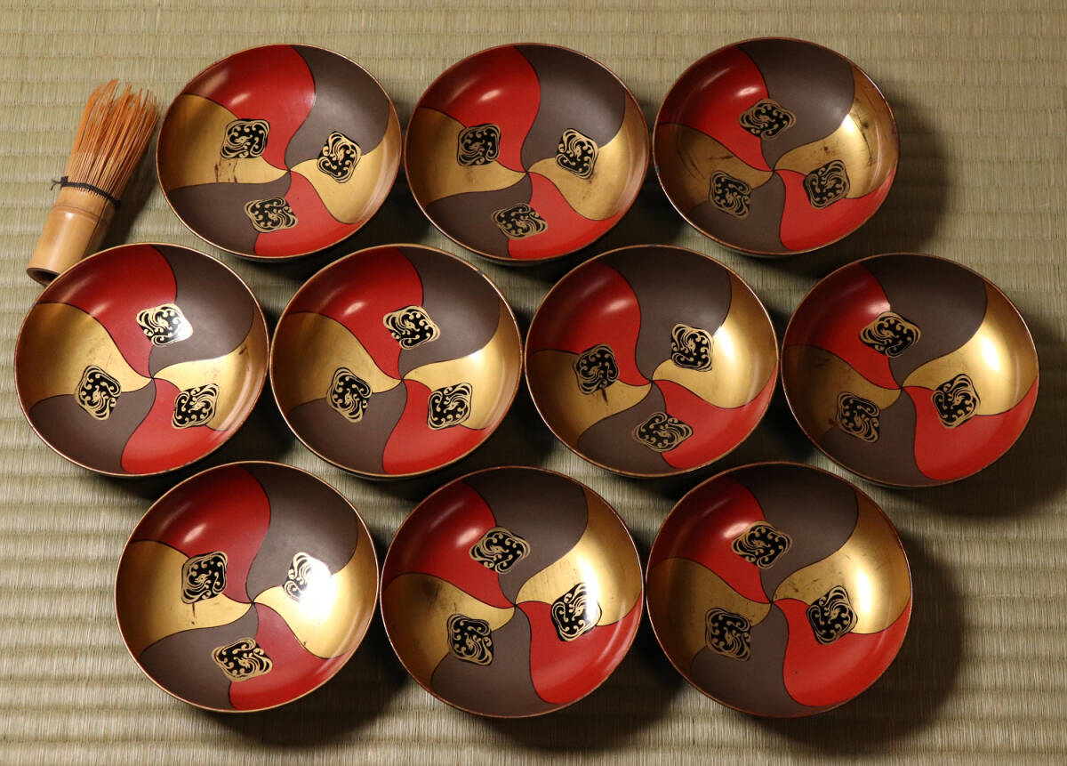 - 時代 木製漆器 捻り模様蒔絵 木皿 十客 幅12cm 天然木 漆芸 菓子皿 銘々皿【MA472】